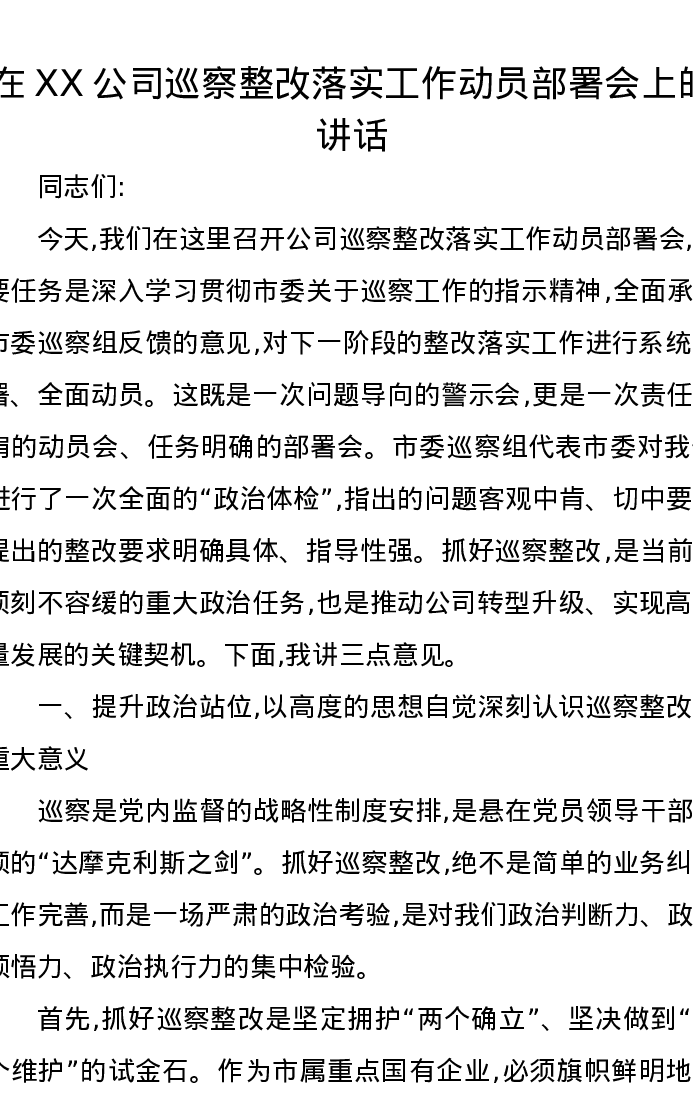 在XX公司巡察整改落实工作动员部署会上的讲话