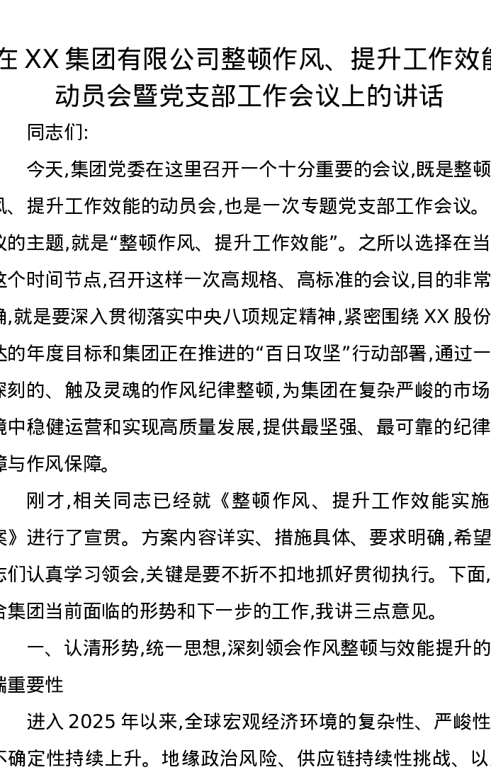 在XX集团有限公司整顿作风、提升工作效能动员会暨党支部工作会议上的讲话