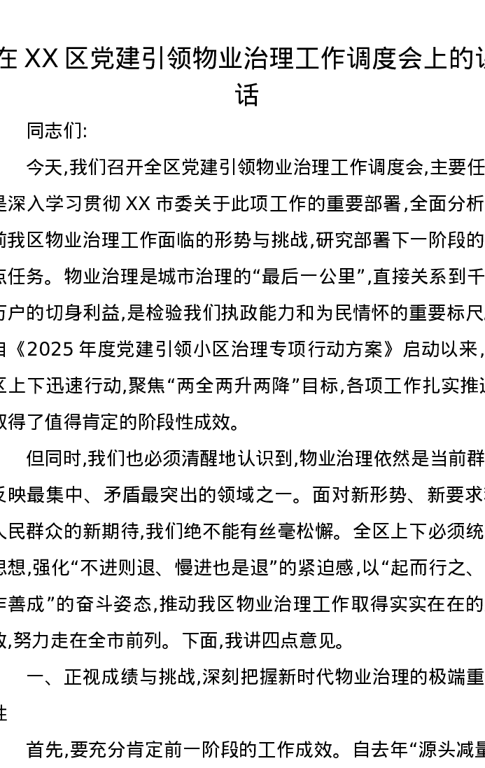 在XX区党建引领物业治理工作调度会上的讲话