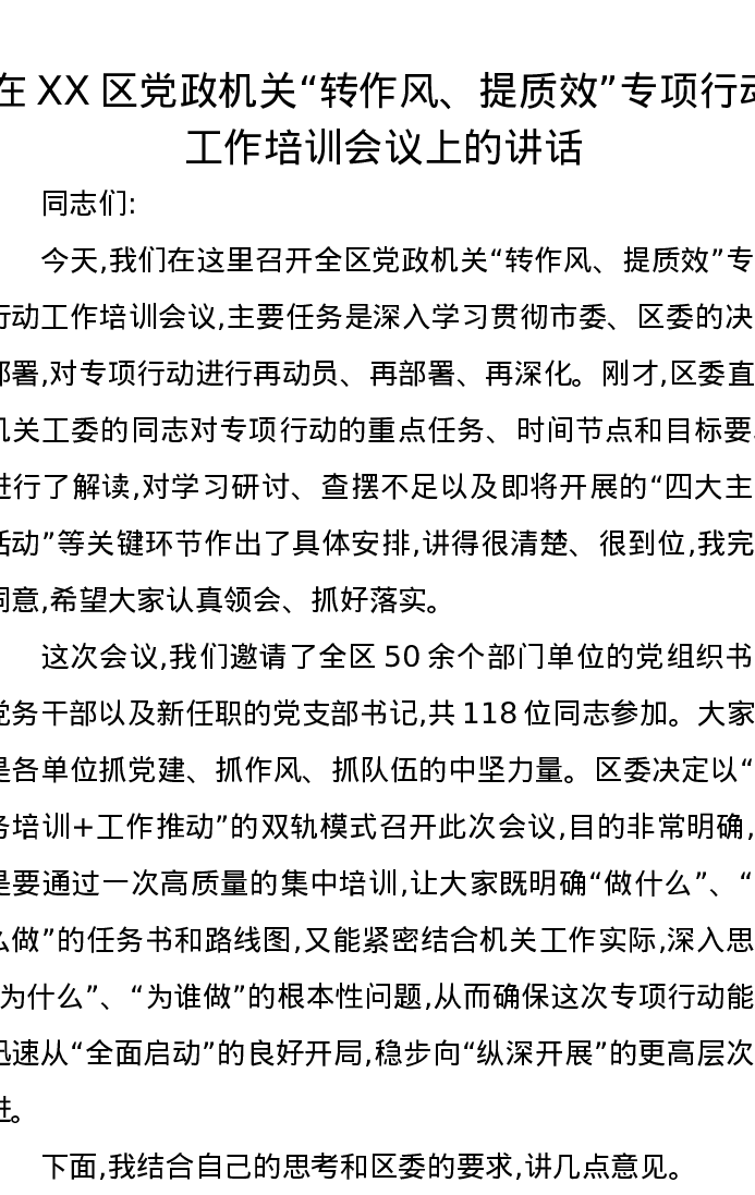在XX区党政机关“转作风、提质效”专项行动工作培训会议上的讲话