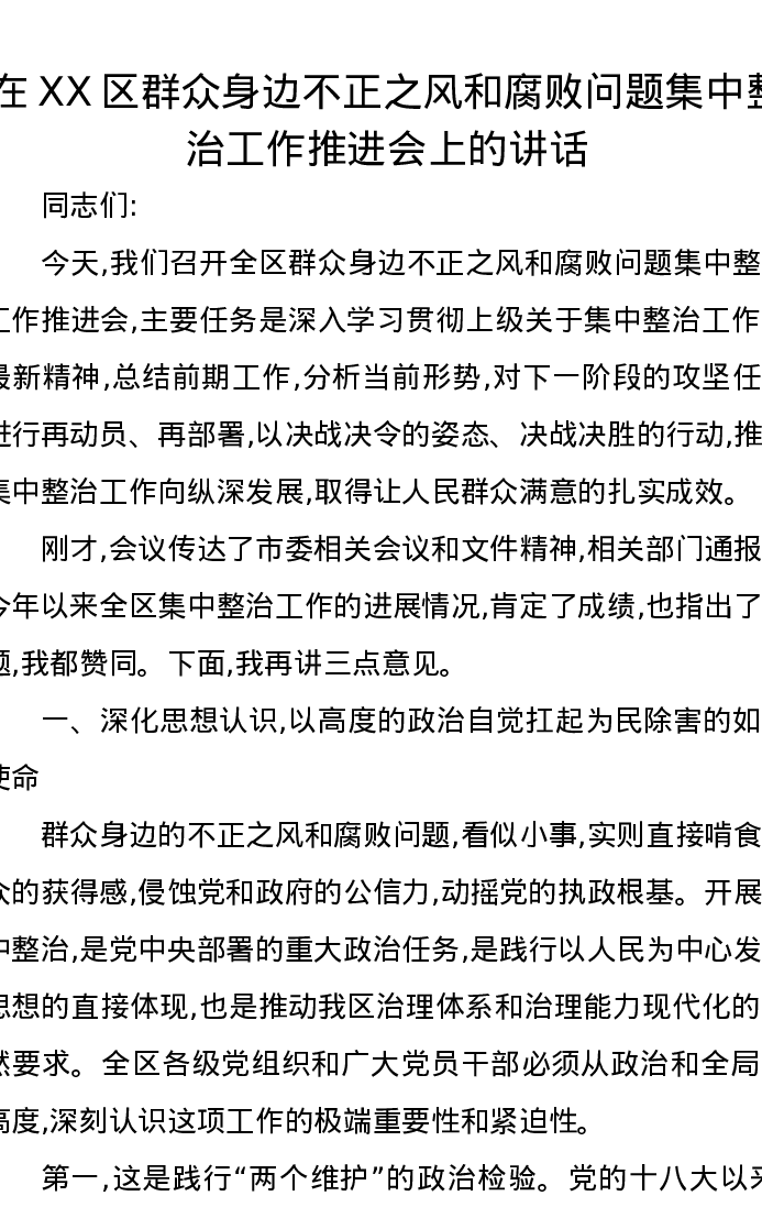 在XX区群众身边不正之风和腐败问题集中整治工作推进会上的讲话