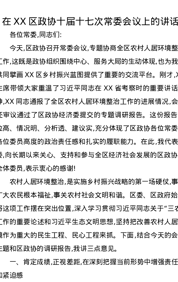 在XX区政协十届十七次常委会议上的讲话