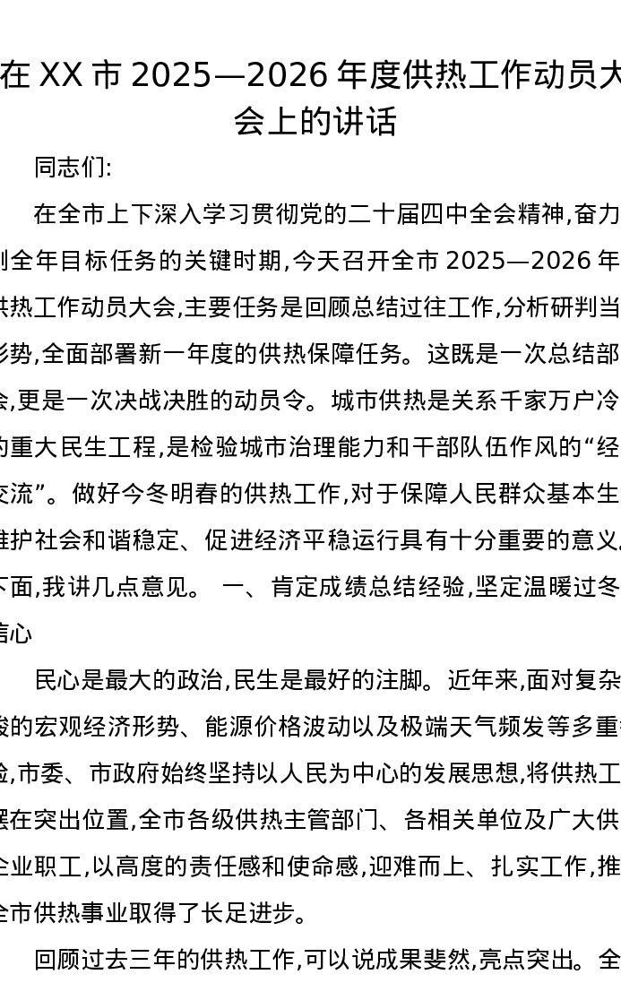 在XX市2025—2026年度供热工作动员大会上的讲话