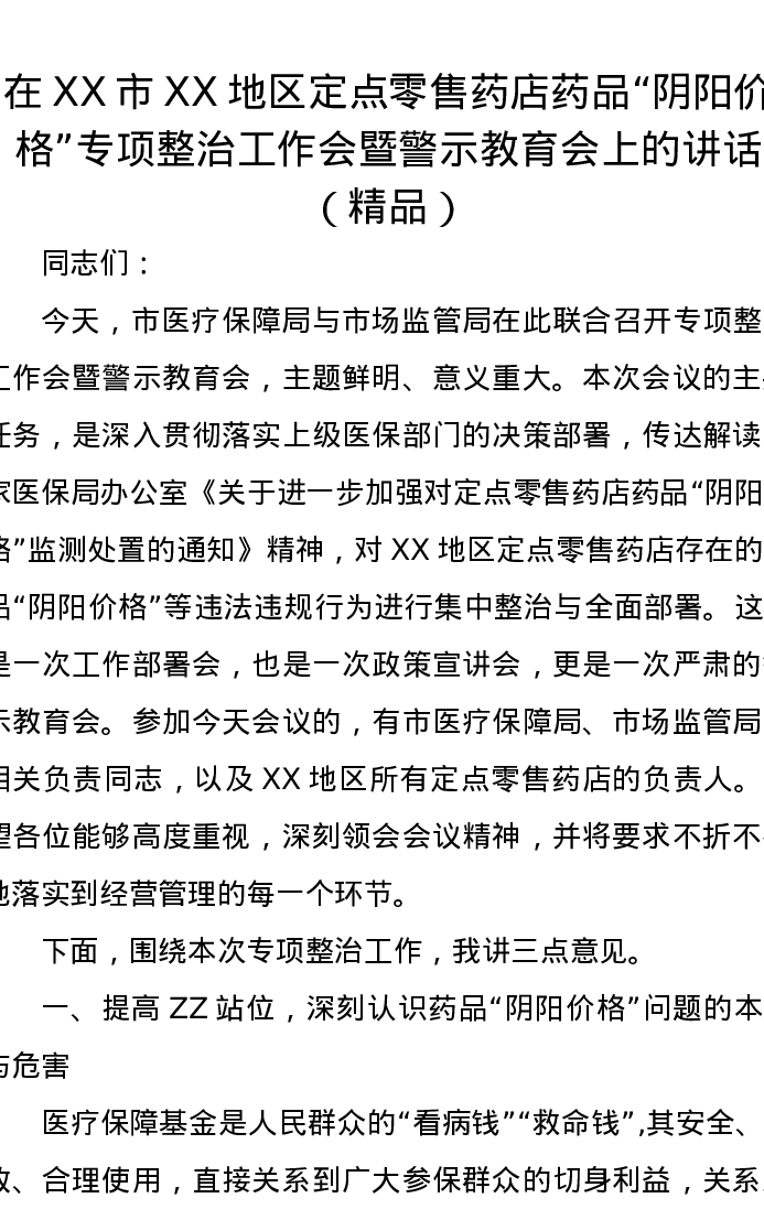 在XX市XX地区定点零售药店药品“阴阳价格”专项整治工作会暨警示教育会上的讲话(精品)