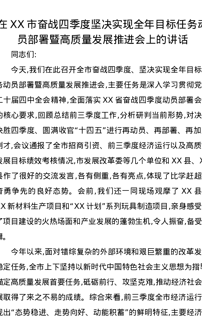 在XX市奋战四季度坚决实现全年目标任务动员部署暨高质量发展推进会上的讲话