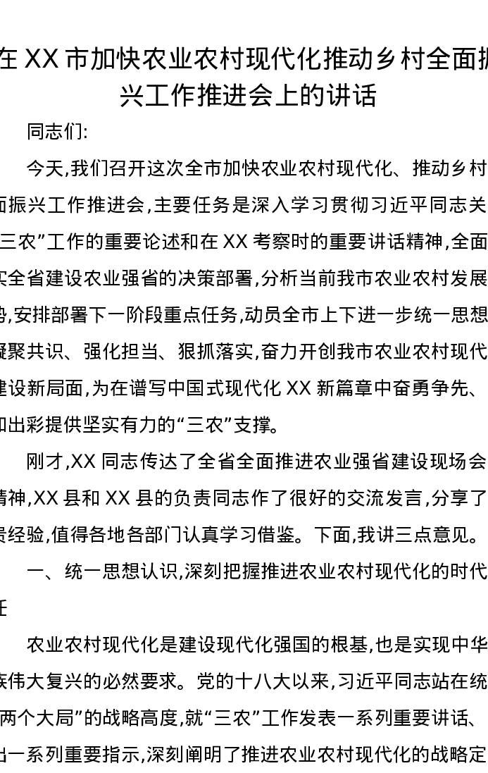 在XX市加快农业农村现代化推动乡村全面振兴工作推进会上的讲话