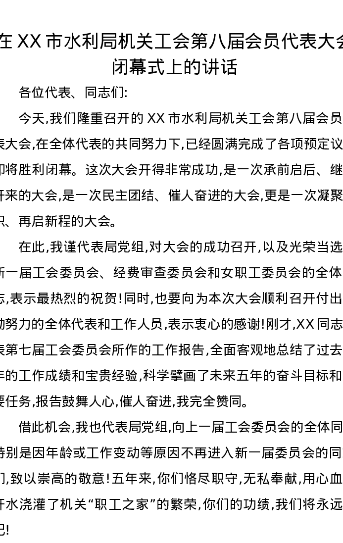 在XX市水利局机关工会第八届会员代表大会闭幕式上的讲话