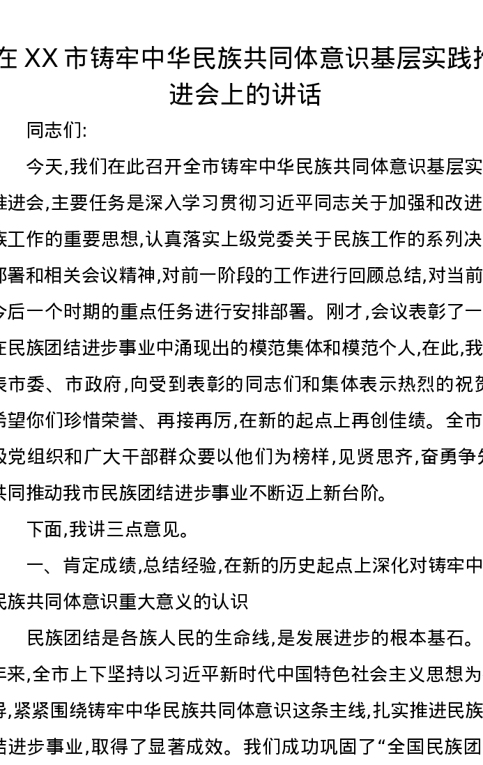 在XX市铸牢中华民族共同体意识基层实践推进会上的讲话