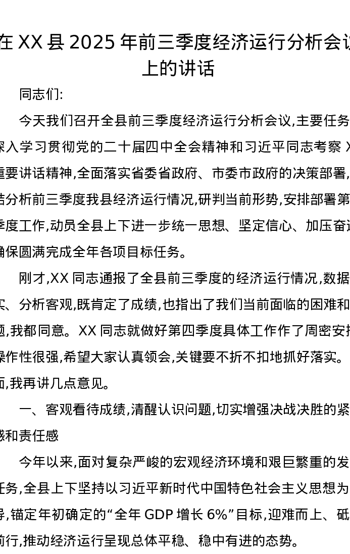 在XX县2025年前三季度经济运行分析会议上的讲话