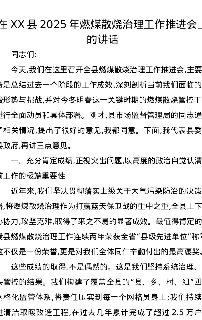 在XX县2025年燃煤散烧治理工作推进会上的讲话