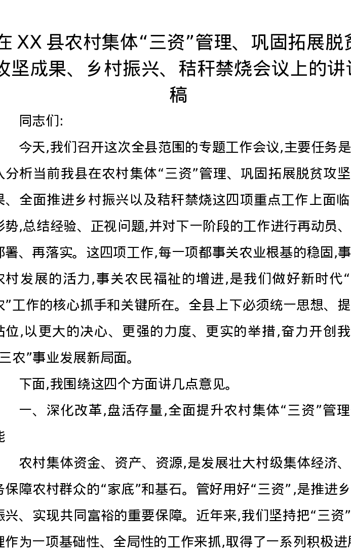 在XX县农村集体“三资”管理、巩固拓展脱贫攻坚成果、乡村振兴、秸秆禁烧会议上的讲话稿