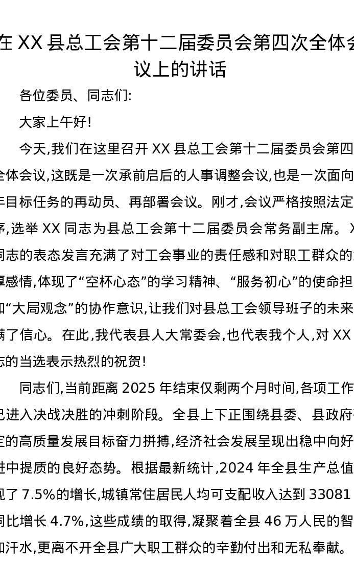 在XX县总工会第十二届委员会第四次全体会议上的讲话
