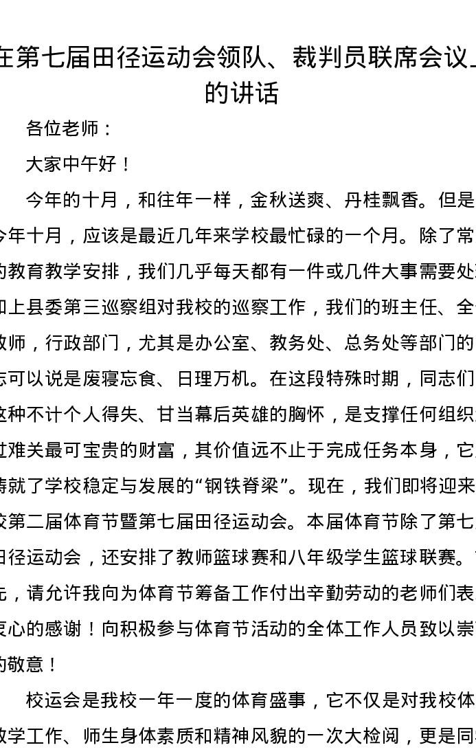 在第七届田径运动会领队、裁判员联席会议上的讲话