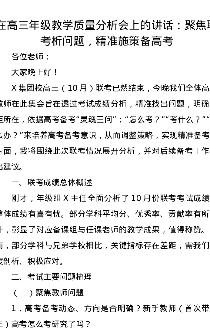 在高三年级教学质量分析会上的讲话:聚焦联考析问题,精准施策备高考