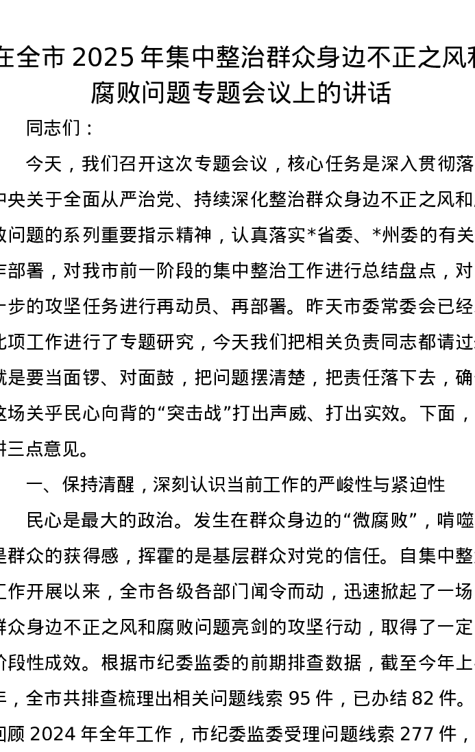 在全市2025年集中整治群众身边不正之风和腐败问题专题会议上的讲话