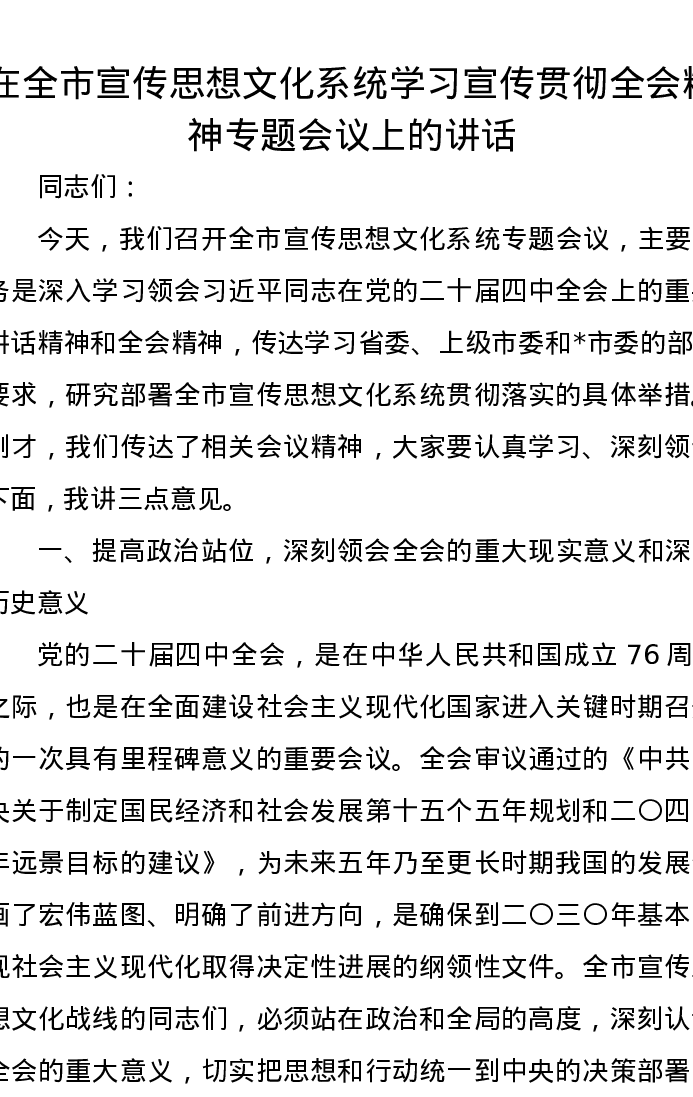 在全市宣传思想文化系统学习宣传贯彻二十届四中全会精神专题会议上的讲话