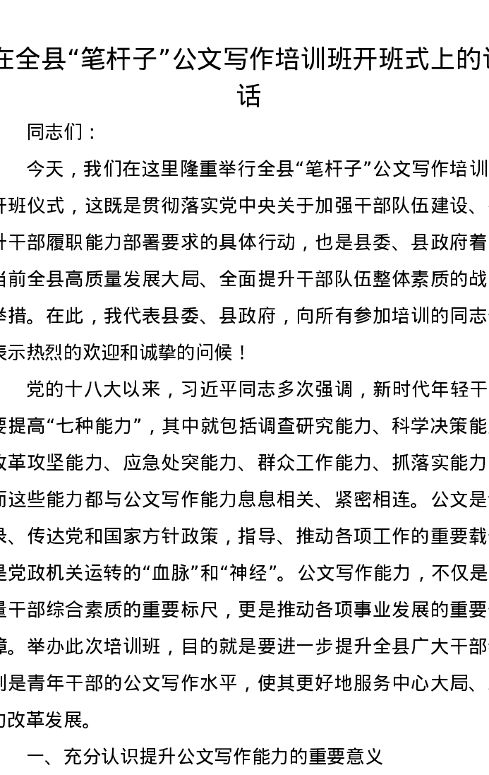 在全县“笔杆子”公文写作培训班开班式上的讲话