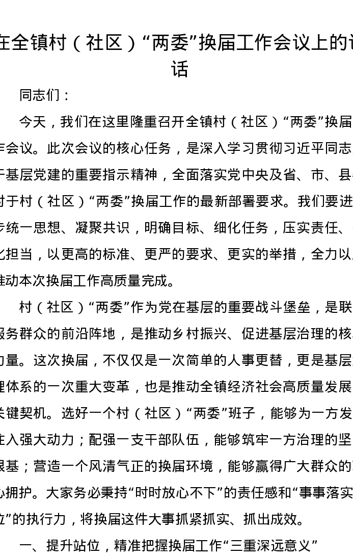 在全镇村(社区)“两委”换届工作会议上的讲话