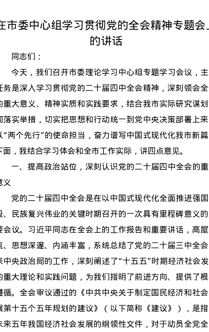 在市委中心组学习贯彻党的二十届四中全会精神专题会上的讲话