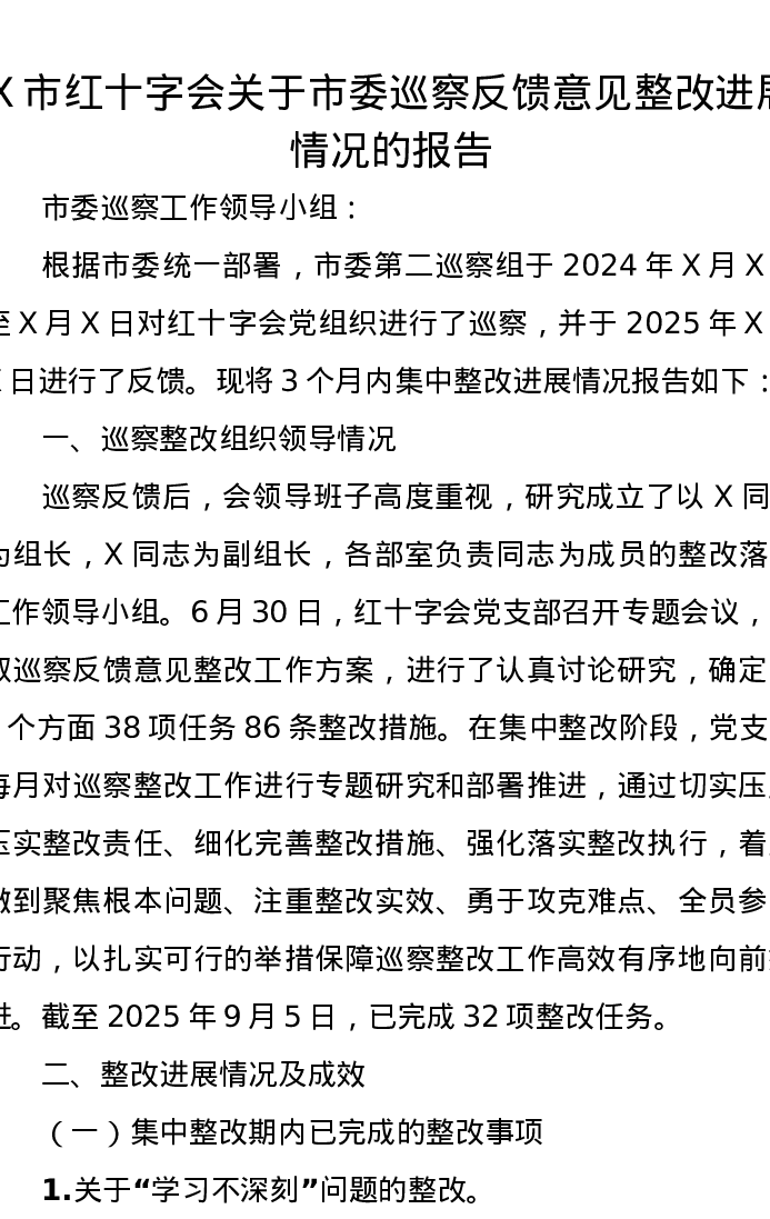 X市红十字会关于市委巡察反馈意见整改进展情况的报告