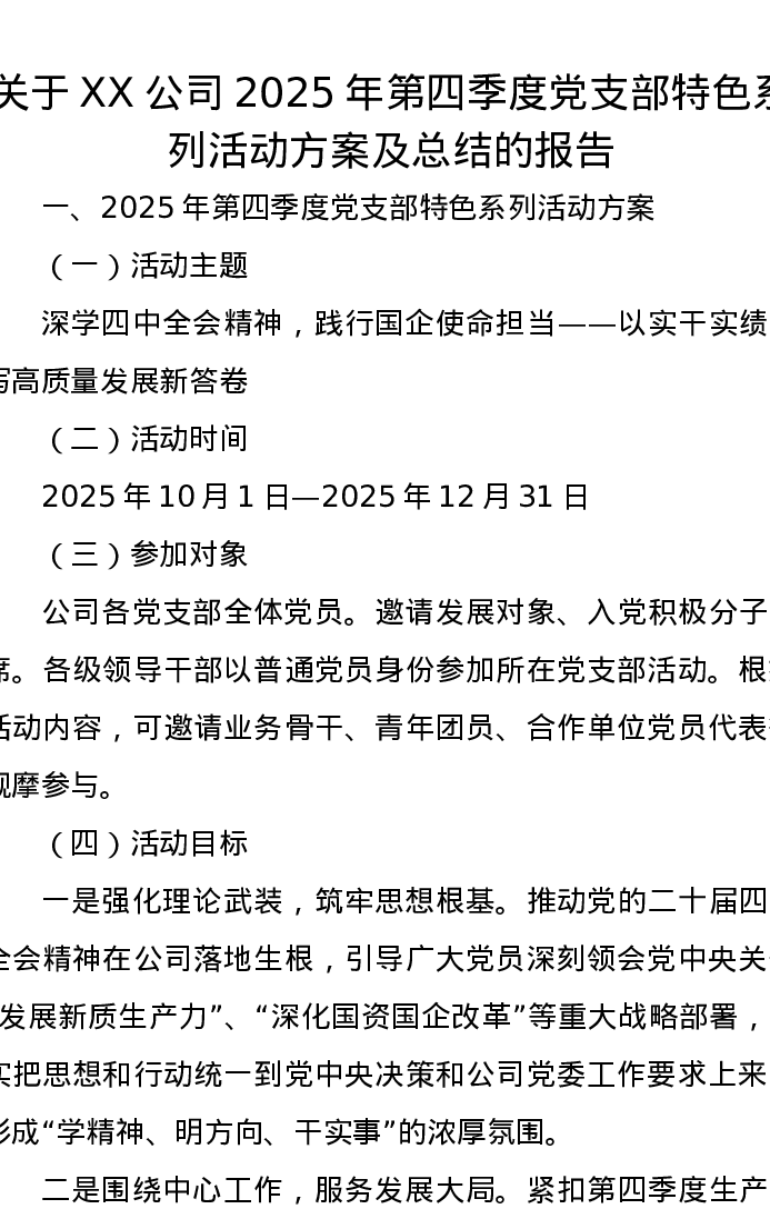 关于XX公司2025年第四季度党支部特色系列活动方案及总结的报告