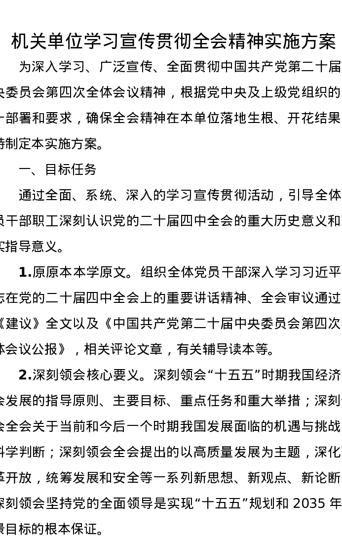 机关单位学习宣传贯彻二十届四中全会精神实施方案