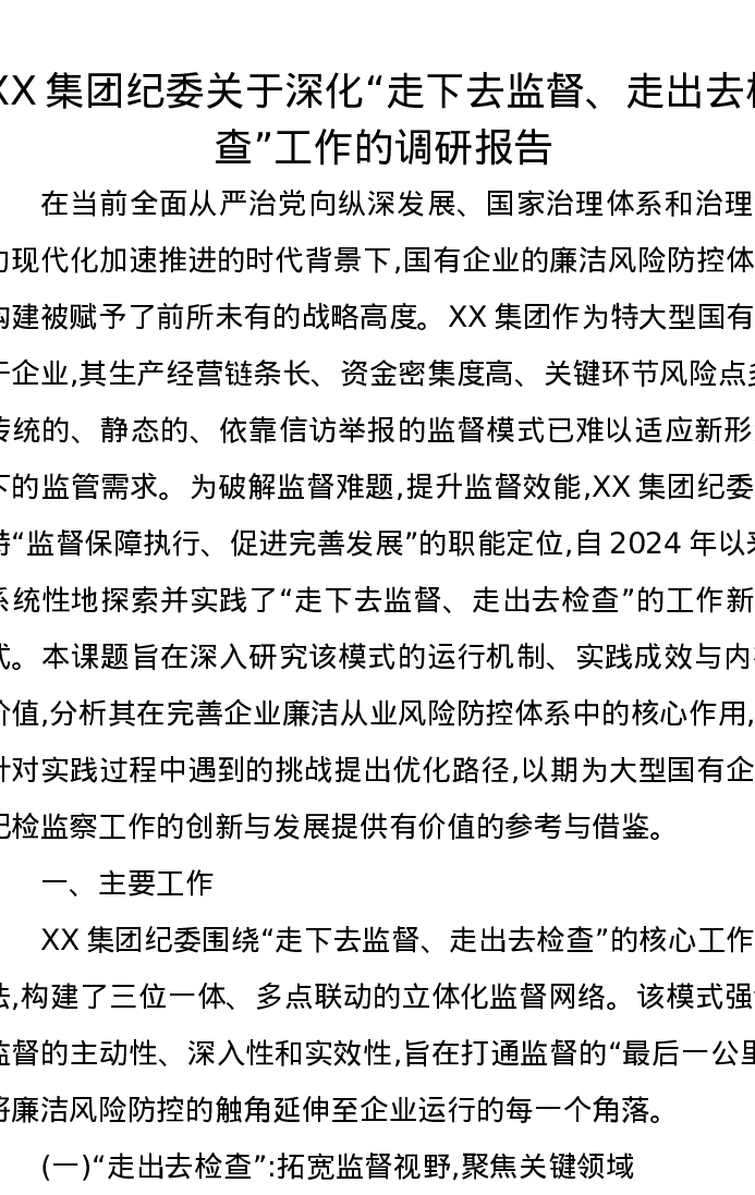 XX集团纪委关于深化“走下去监督、走出去检查”工作的调研报告