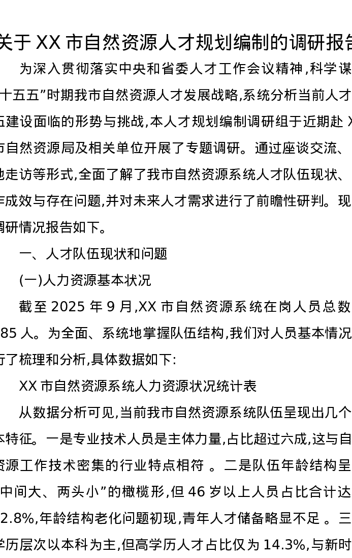 关于XX市自然资源人才规划编制的调研报告