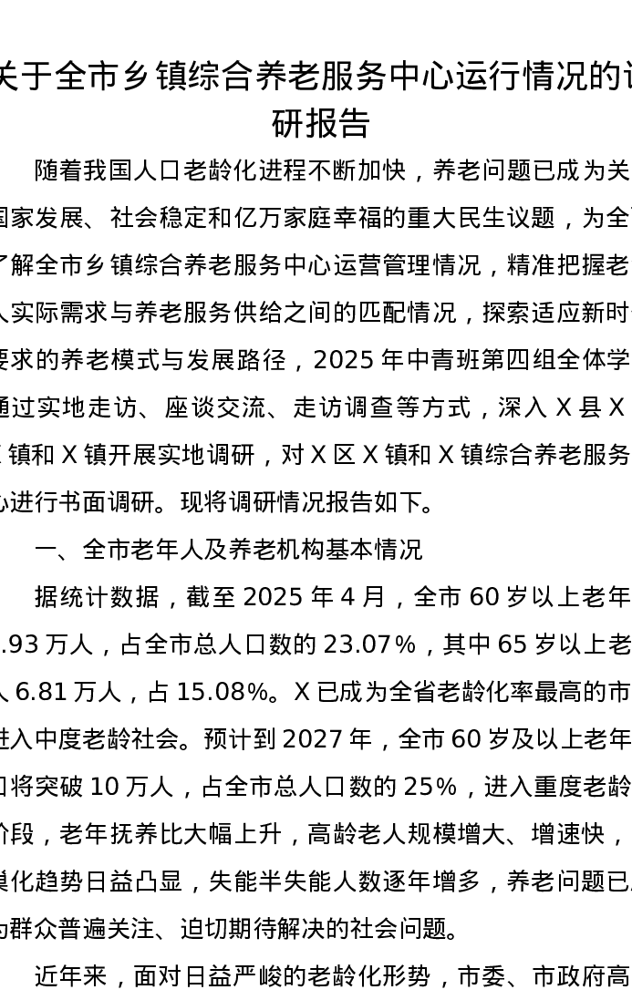 关于全市乡镇综合养老服务中心运行情况的调研报告