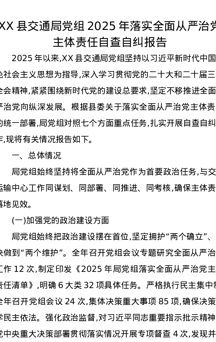 XX县交通局党组2025年落实全面从严治党主体责任自查自纠报告