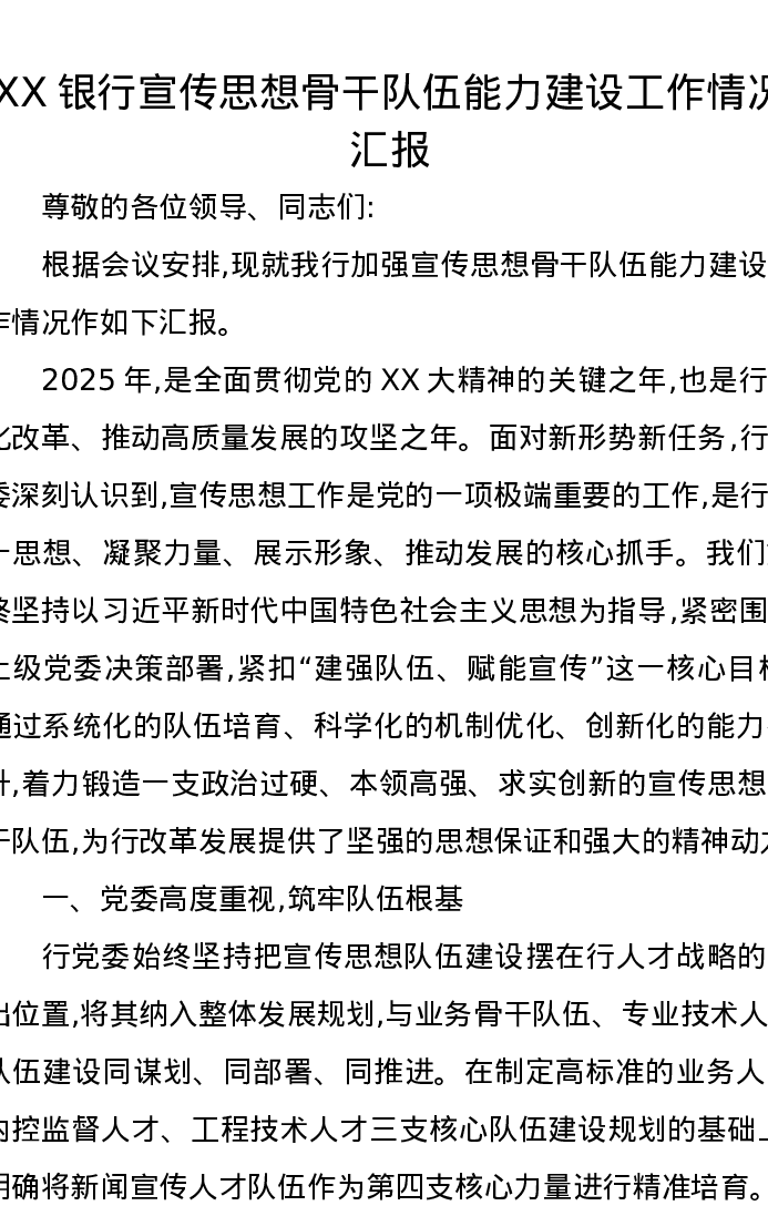 XX银行宣传思想骨干队伍能力建设工作情况汇报
