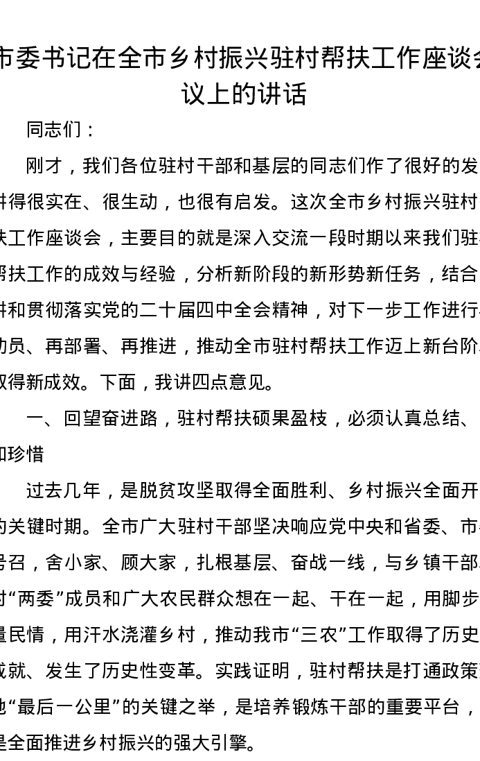 市委书记在全市乡村振兴驻村帮扶工作座谈会议上的讲话