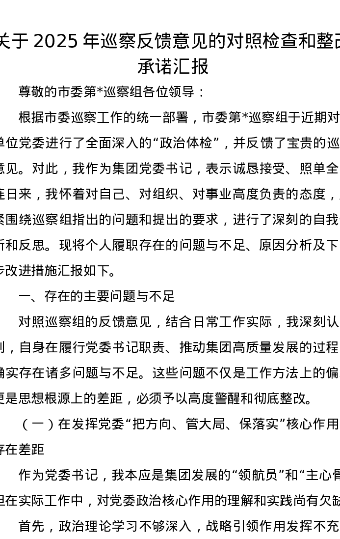 关于2025年巡察反馈意见的对照检查和整改承诺汇报