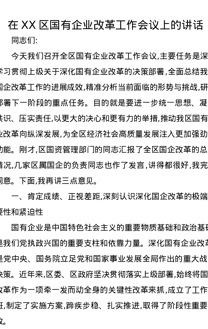 在XX区国有企业改革工作会议上的讲话