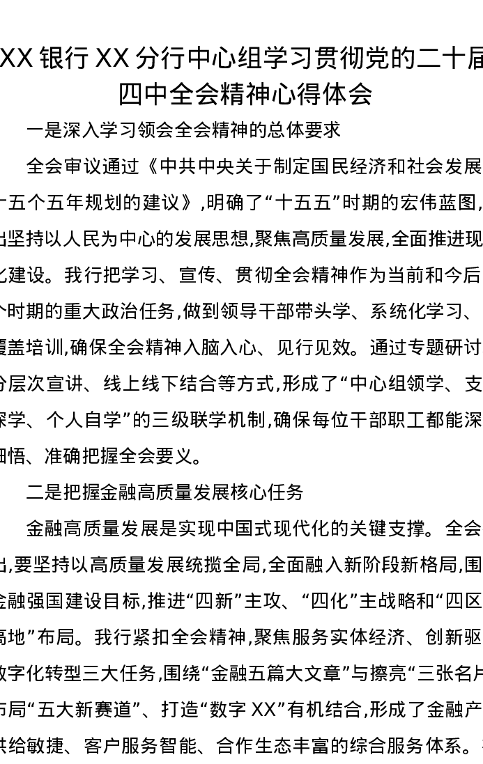 XX银行XX分行中心组学习贯彻党的二十届四中全会精神心得体会
