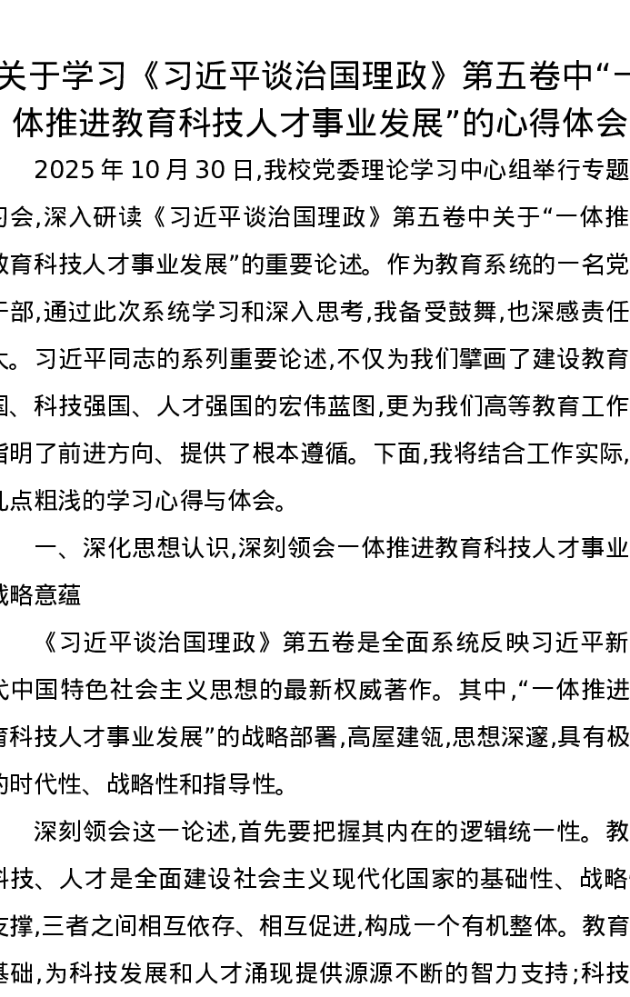 关于学习《习近平谈治国理政》第五卷中“一体推进教育科技人才事业发展”的心得体会