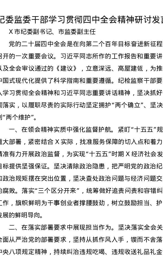 纪委监委干部学习贯彻四中全会精神研讨发言汇编4篇