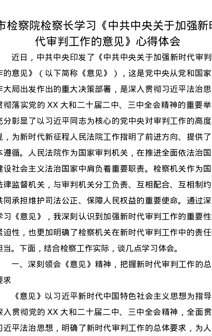 市检察院检察长学习《中共中央关于加强新时代审判工作的意见》心得体会