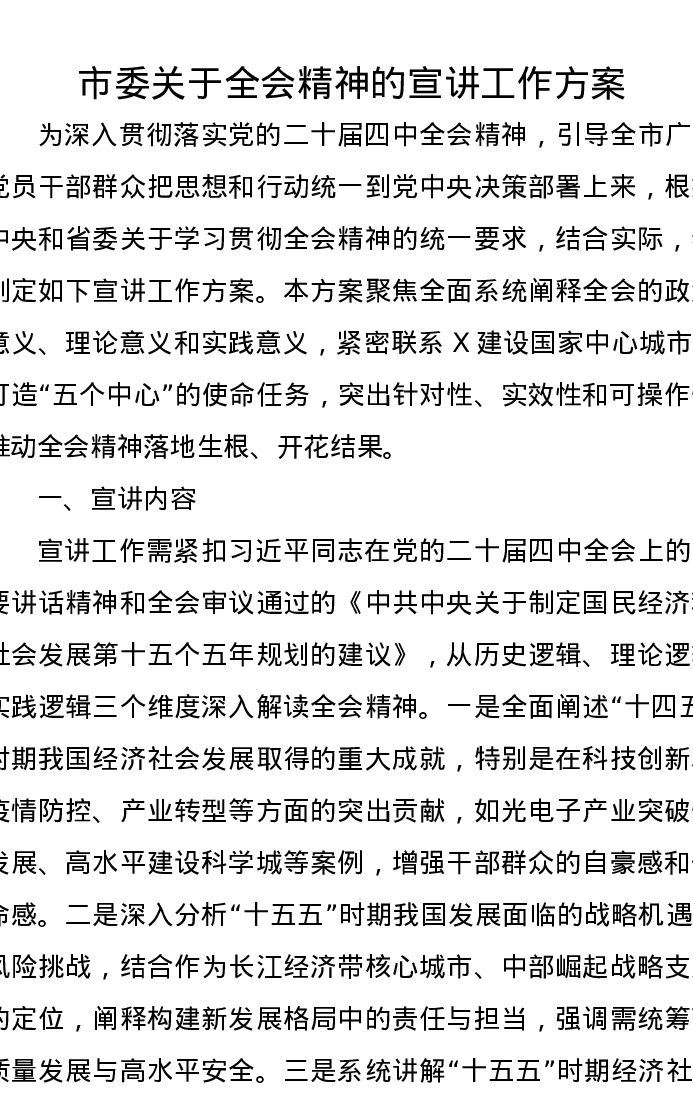 市委关于二十届四中全会精神的宣讲工作方案