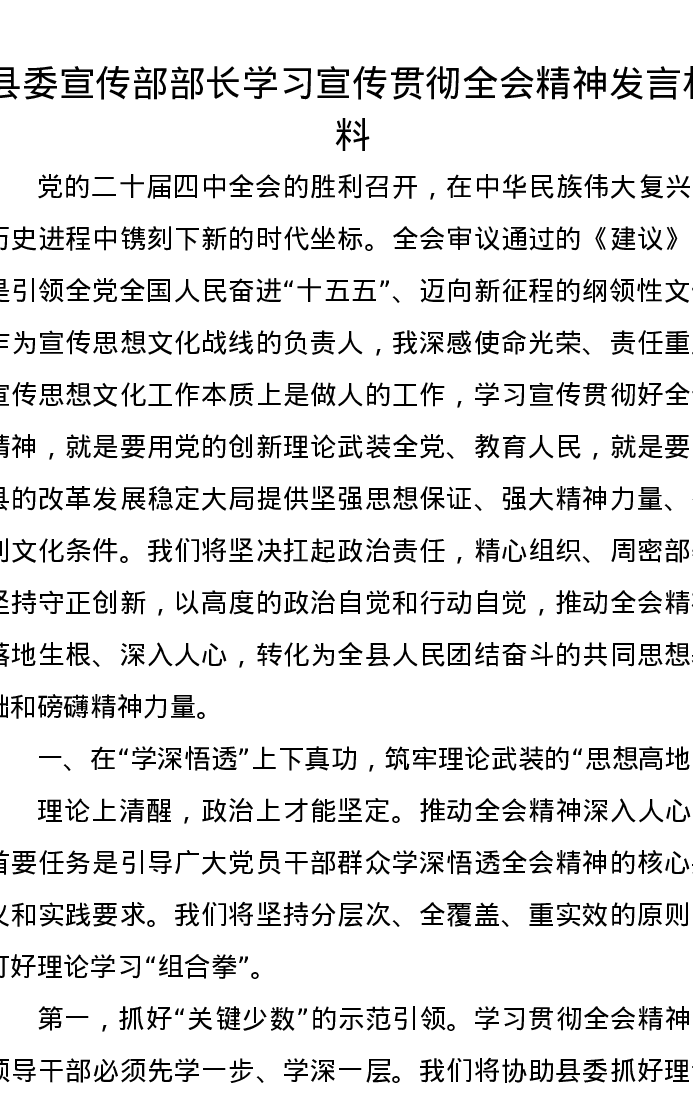 县委宣传部部长学习宣传贯彻二十届四中全会精神发言材料