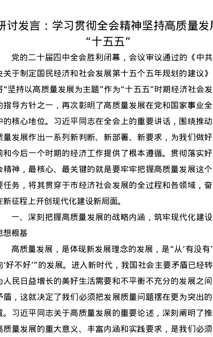 研讨发言:学习贯彻二十届四中全会精神 坚持高质量发展“十五五”