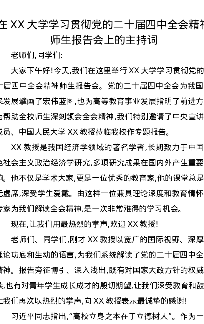 在XX大学学习贯彻党的二十届四中全会精神师生报告会上的主持词