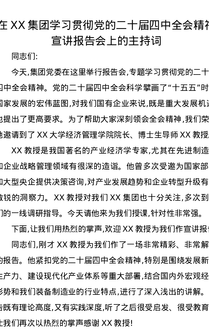 在XX集团学习贯彻党的二十届四中全会精神宣讲报告会上的主持词