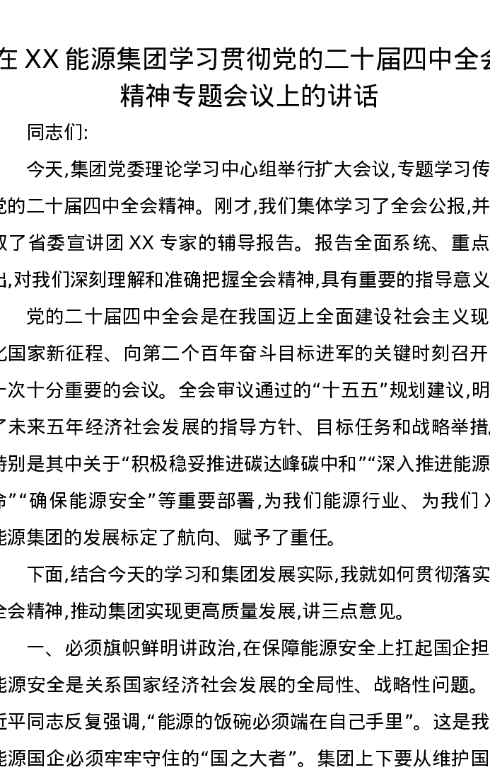 在XX能源集团学习贯彻党的二十届四中全会精神专题会议上的讲话