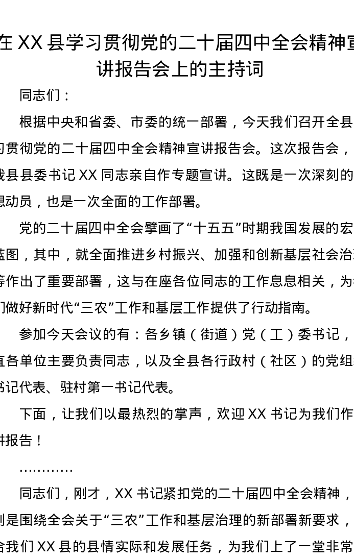 在XX县学习贯彻党的二十届四中全会精神宣讲报告会上的主持词