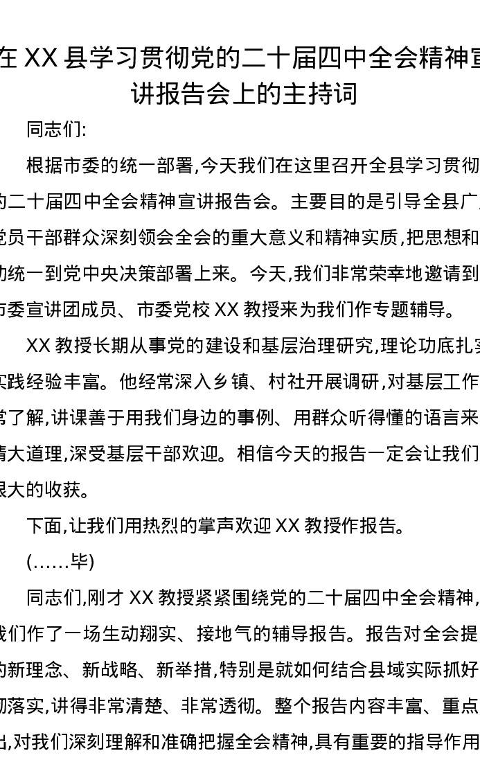 在XX县学习贯彻党的二十届四中全会精神宣讲报告会上的主持词1