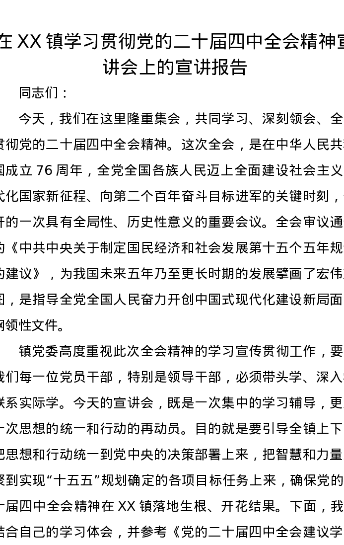 在XX镇学习贯彻党的二十届四中全会精神宣讲会上的宣讲报告