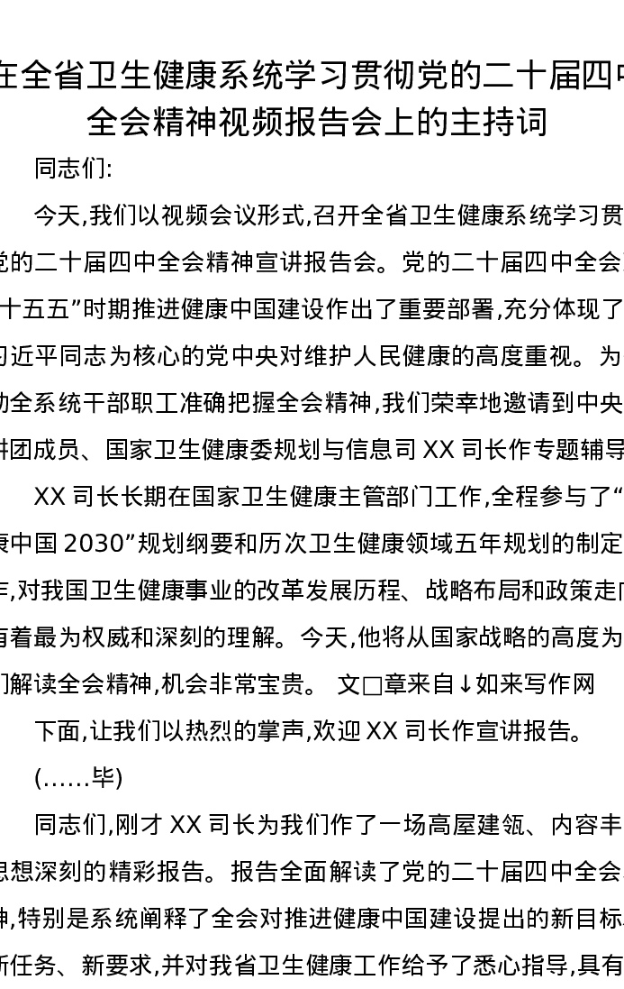 在全省卫生健康系统学习贯彻党的二十届四中全会精神视频报告会上的主持词