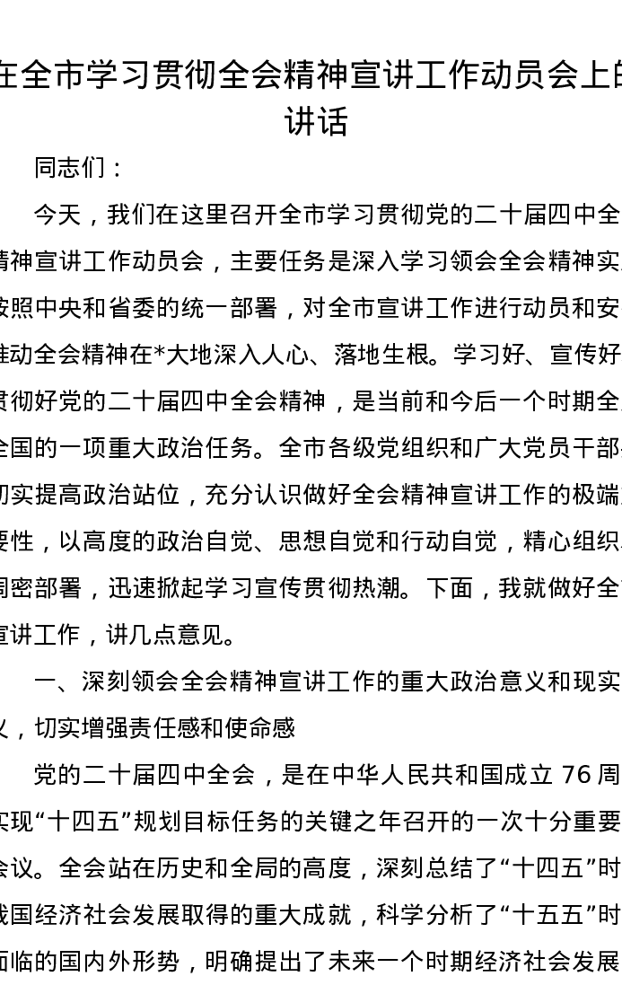 在全市学习贯彻二十届四中全会精神宣讲工作动员会上的讲话