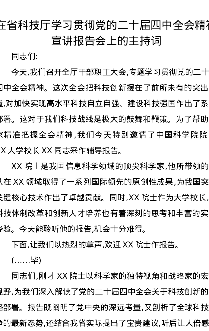 在省科技厅学习贯彻党的二十届四中全会精神宣讲报告会上的主持词